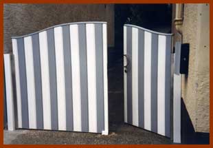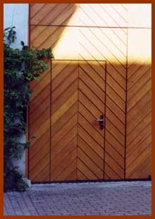 2-flügeliges Hoftor aus Kiefer massiv mit Verbretterung, zweifarbig mit Dickschichtlasur lackiert.