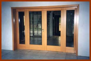 2-flügelige Türe mit feststehenden Seitenteilen, Türzarge aus Buche natur, Füllungen aus Floatglas.