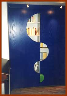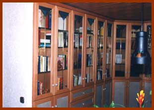 Kombination aus Schränken und offenen Regalen mit integrierten Schreibtisch. Gefertigt aus Buche natur mit diversen Glas- und Edelstahlelementen.