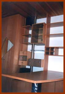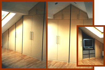 In Dachgiebel auf Maß eingpaßt. Dekor-Oberfläche mit farblich abgesetzten Dekorleisten. TV-Fach in Aluminium Front. Edelstahl-Griffstangen.