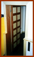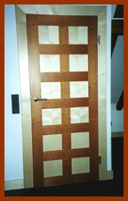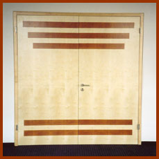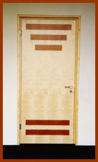 Maßanfertigung nach Kundenwunsch. Türe und Zarge in Spitzahorn gedämpft / Ahorn Natur. Türe in aufwendigem Intarsien-Design (Funiertechnik). Hochwertige Edelstahlbeschläge.