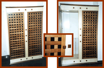 Garderobe aus Ahorn / Nußbaum Massivholz, klar lackiert. Türen: Rahmentüren mit zurückspringenden, schwarzen Füllungen. Ahorn Blenden mit Nußbaum Funiereinlagen (dunkle Quadrate).