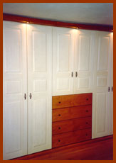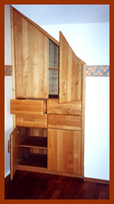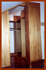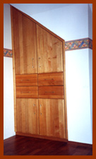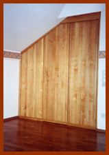 Einbauschrank aus Erle-Dreischicht Massivholz, Oberfläche gewachst. In Dachschräge eingpaßt mit Drehtüren und Schubkästen.