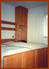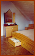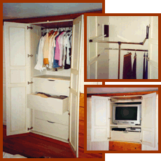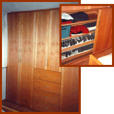Erle funiert mit aufgesetzten Massivholzleisten, klar lackiert. Kleiderschrank mit Dreh- und Schiebetüren, aufwendige Inneneinteilungen, Wäschekörbe mit Auszügen.
