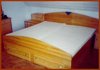 Doppelbett aus Erle Massivholz, klar lackiert. 2 Schubkasten unter den Matratzen.